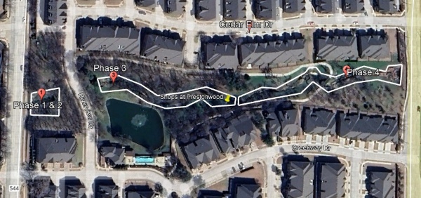 We’re pleased to inform you that the Creek Clean Project has officially begun at The Shops at Prestonwood. This important initiative will be completed in four phases beginning with Phase 1 & 2 , as outlined in the map below.